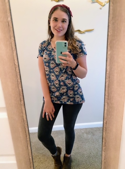 We started the project on a Monday, a workday for me. On Monday, she dressed me up for work in a pair of dark gray leggings, a rose and skull patterned v-neck tee from Lularoe, dark brown Rocket Dog booties, a maroon-colored headband, pink ball earrings, and a heart-shaped necklace. This outfit was comfortable but also dressy enough to wear to work. I would call it a comfy business casual look.
