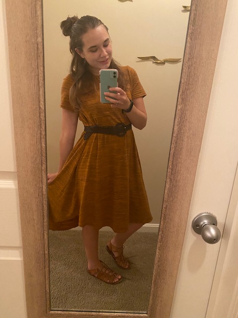 Lastly, we have Sunday. This was outfit was chosen for me to wear to church. I was in a heathered rusty orange casual dress, brown tie-up sandals, and a belt to go over the dress. I loved this outfit so much and the colors reminded me of fall; my favorite fashion season.
