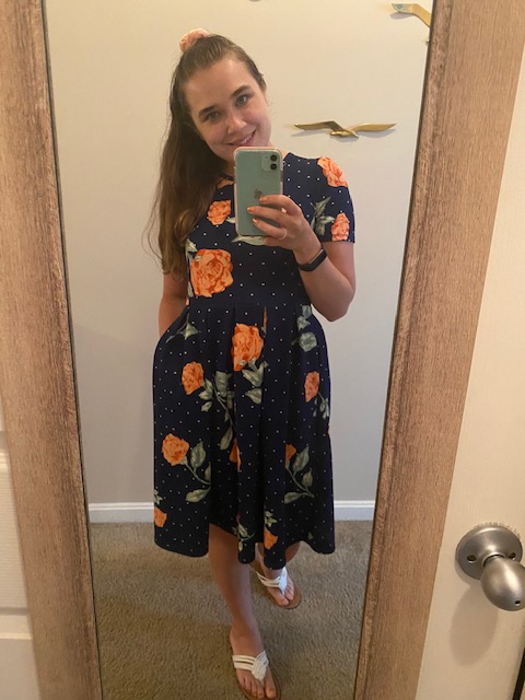 Thursday’s outfit matched my own style. Salena chose a Lularoe Amelia sundress with a pink rose and polka dot pattern. The dress was paired with some white banded sandals and a peach-colored scrunchie. This look is very sweet and summery. I love dresses, they are my go-to clothing item so I was very excited to wear this outfit. I love the versatility of dresses; you can look dressed up, casual, cute, they work for just about any style. I felt cute all day in this outfit.