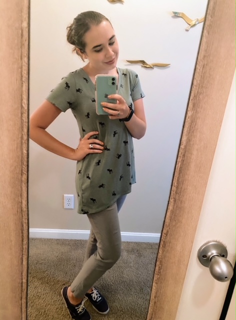 Salena chose a more simplistic workday look for me on Wednesday. She put me in a pair of light-gray dress pants and paired them with a green moose printed v-neck tee from Lularoe. She accessorized this look with navy blue Keds. This outfit doesn’t have much bling but it still looks stylish, I think simple looks are one of the best styles! The color scheme of this look also gives off rustic vibes.